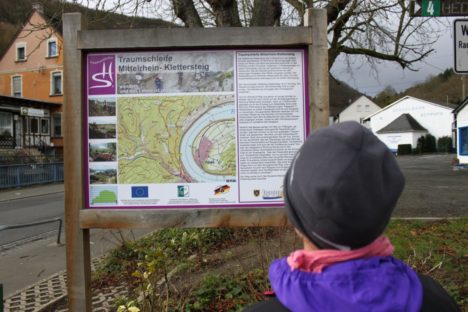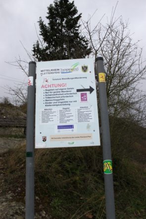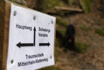 In Boppard angekommen fanden wir einen Parkplatz in unmittelbarer Nähe des Klettersteiges. Da wir nur wenige km laufen wollten, ließen wir den Laufrucksack im Auto. In unserer Euphorie verpassten wir dennoch die Abzweigung zum Klettersteig direkt vor unserer Nase und liefen erstmal ein paar Minuten die Straße entlang, eher wir merkten, dass wir auf einem Irrweg sein müssen. Also Umkehr und kurz vor dem Parkplatz haben wir dann doch noch die richtige Abzweigung entdeckt.