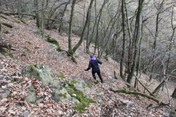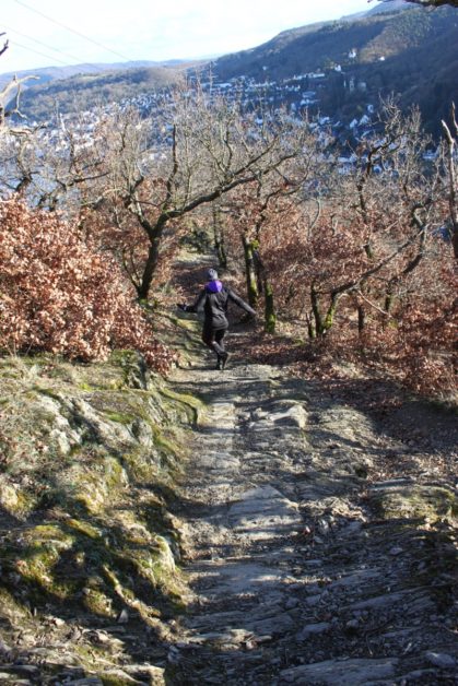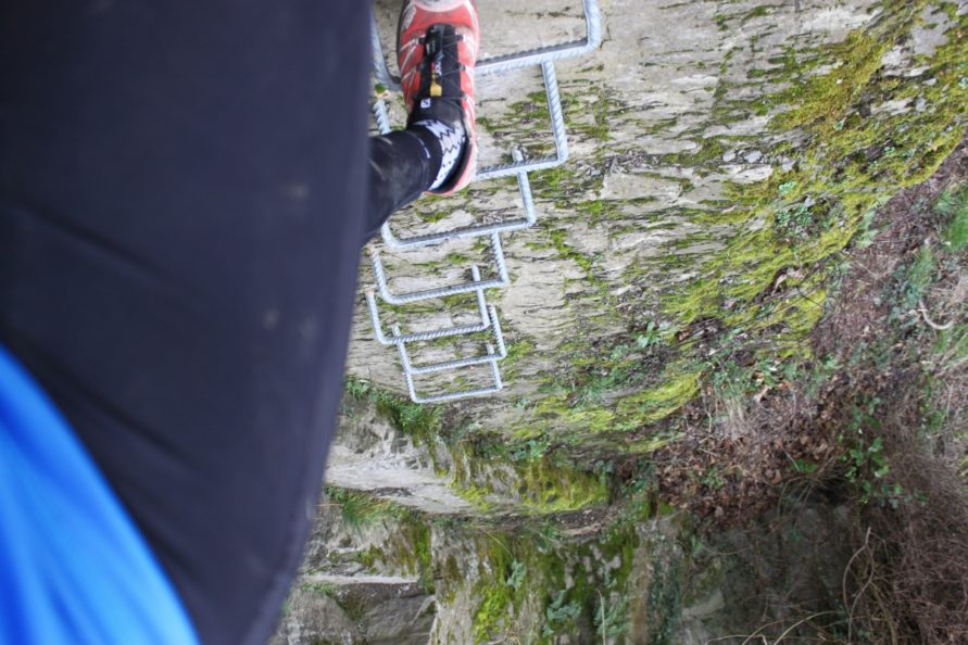 Leitern machen tatsächlich den Großteil des Klettersteiges bei Boppard aus. Die insgesamt 11 Stationen des Klettersteiges (wir haben nur 10 gezählt) werden durch Singletrails entlang des Berges miteinander verbunden. Diese Teilstücke absolvierte meine Freundin in einem beeindruckend Tempo und ich hatte fast Mühe ihr zu folgen.