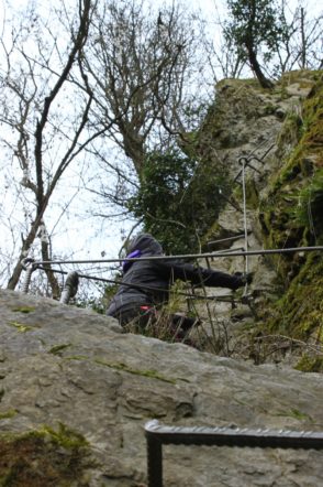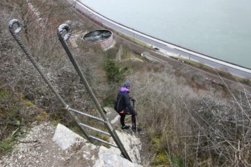 Der Klettersteig beginnt mit einer harmlosen Leiter, die keinerlei Probleme bereitet. Wenn man es, wie wir, jedoch nicht gewohnt ist, ist der Abstieg an einer solchen Leiter dennoch mit einer gewissen Euphorie verbunden: Irgendwie geht es ja doch ziemlich direkt runter und alles ist neu und ungewohnt. Dazu gesellt sich ein sehr imposanter und erhabenerAusblick auf die Rheinschleife bei Boppard.