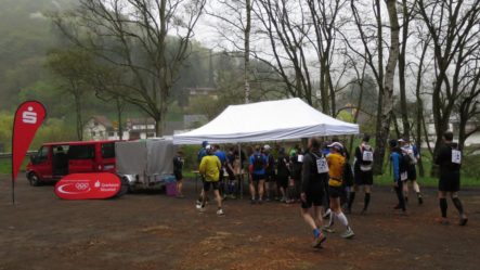 Es ist samstags morgens. 5 Uhr. Der Wecker klingelt. Nun wäre weiterschlafen eine Option. Der Griff in Richtung Wecker führt jedoch ins leere. “Ach ja. Stimmt ja…Strategische Positionierung des Weckers”. Ich erinnere mich langsam. Damit ich auch ja aufstehen muss, stellte ich den Wecker in ein anderes Zimmer. Also ab aus dem Bett. Duschen, Trinkflaschen füllen und noch ein paar andere Kleinigkeiten erledigen, die man eigentlich hätte schon am Vorabend vorbereiten können. Um 6:15 Uhr machte ich mich dann mit meiner Freundin auf den Weg zum Startpunkt am Sportplatz vom Mut zum WUT 2014. Nach der Einholung der Startunterlagen gab es die Möglichkeit einen Dropbag auszulagern, der dann an den insgesamt 4 Verpflegungspunkten zur Verfügung stand. Diese waren auf der insgesamt 65 km langen Strecke mit 2100 Höhenmetern in einem Abstand von ca. 15 km verteilt.