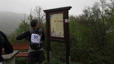 Den Bereich der Sportanlage verließen wir in Richtung Süden, überquerten ein kleines Brückchen, durchquerten Hausen und machten uns dann auf zum “Gipfelkreuz” des Malbergs. Mit dem ca. 370 Meter hohen Malberg sollte unser erste Berg auch der insgesamt höchste Berg des heutigen Ultratrails sein. Nach einer kleinen informativen Ansprache von unserem “Touristenführer und Tourguide” Wolfgang ging es dann jedoch auch schon weiter. Noch vor der ersten Verpflegungsstelle in Datzeroth ging es dabei noch am Ehrenmal in Rockenfeld vorbei.
