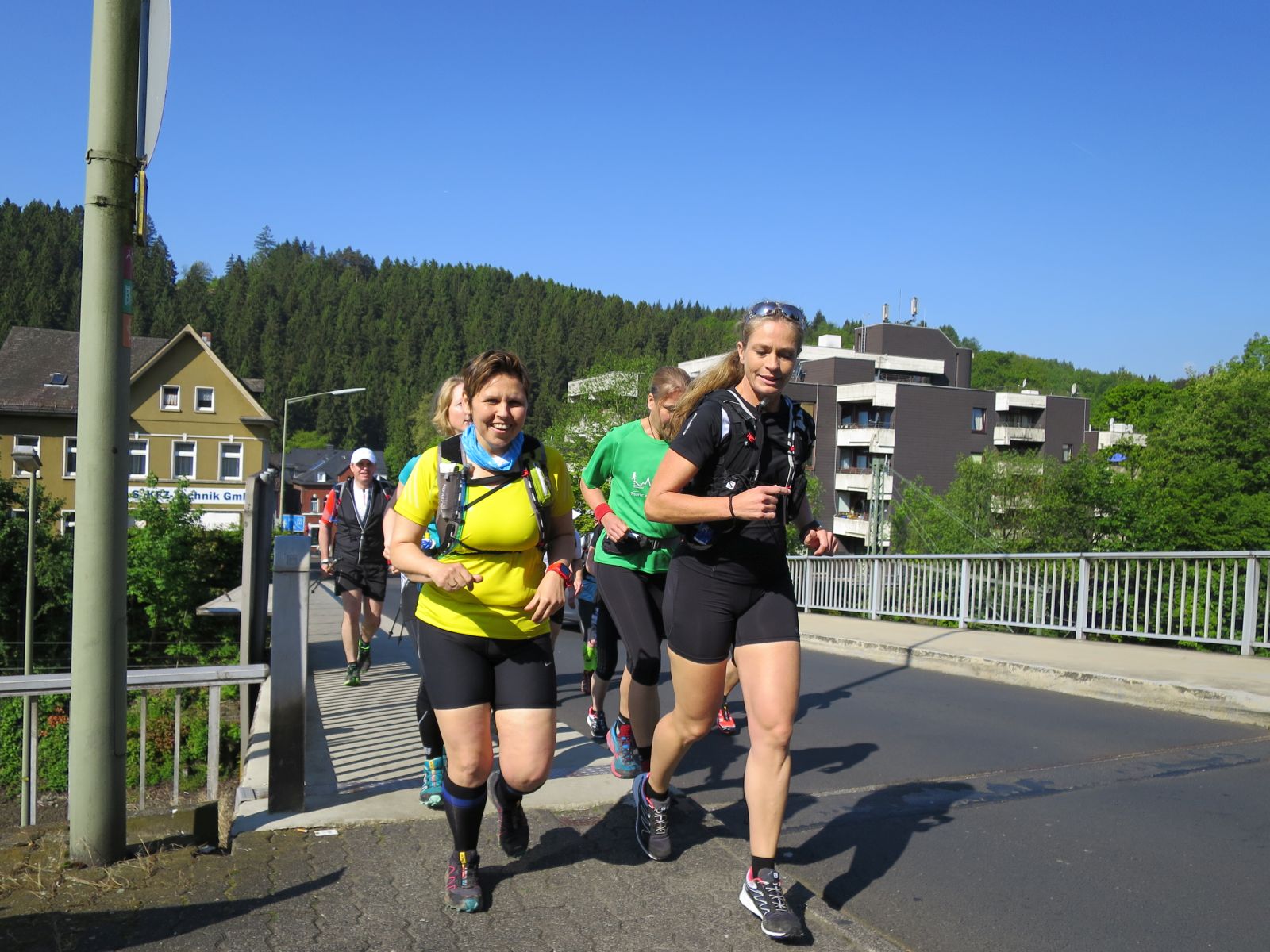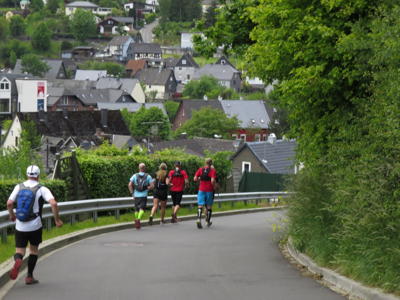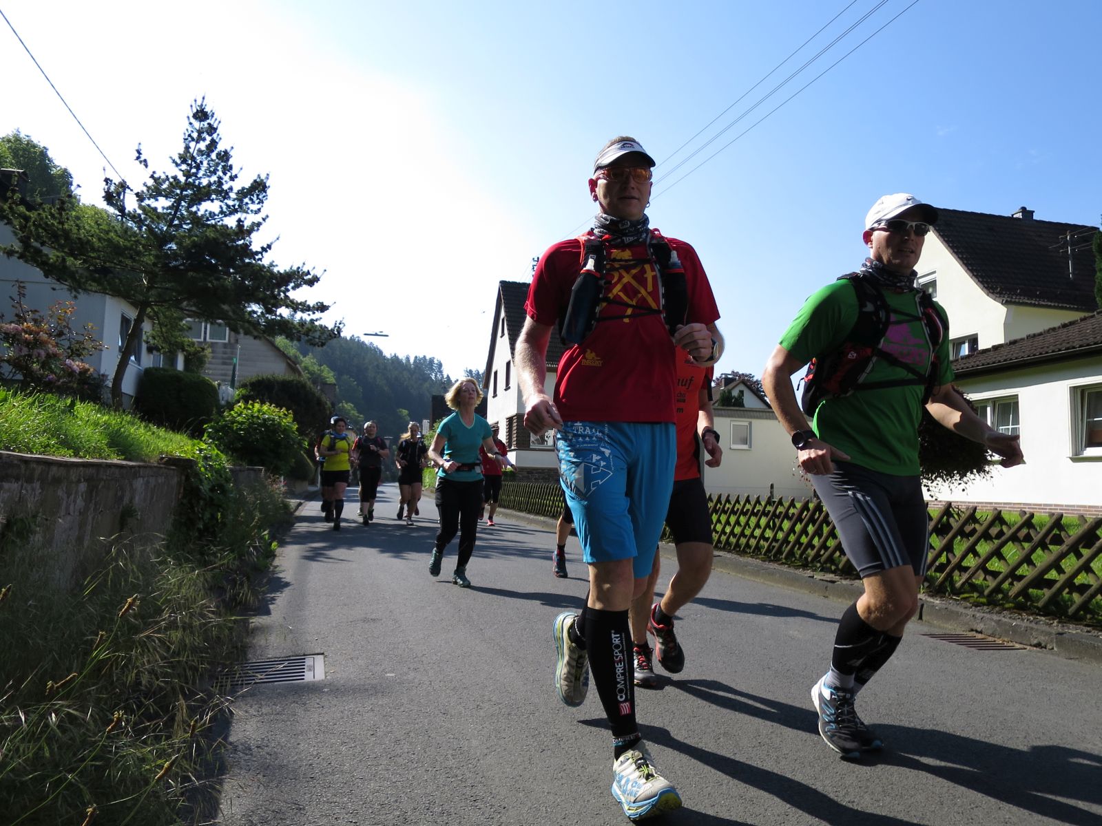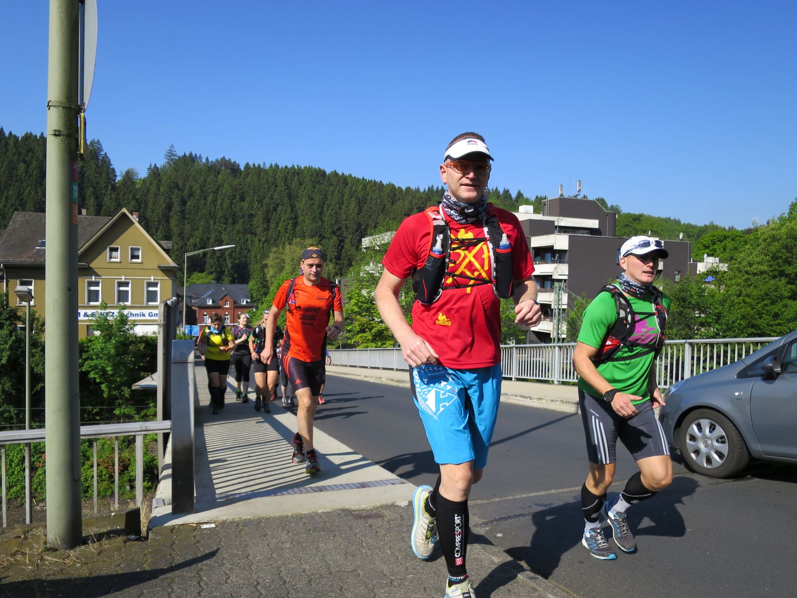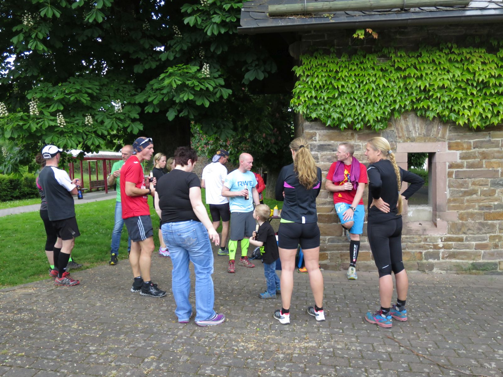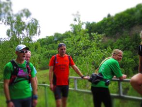 Alle Zweifel und Ängste waren aber direkt verflogen, als wir in Kirchen ankamen und von den dort schon versammelten Läufern im äußerst sympathischen Eiscafe Cafe Gelateria by Brustolon in unmittelbarer Bahnhofsnähe herlich in Empfang genommen wurden. Wir stellten schnell fest, dass Hansi und co. mindestens genauso laufverrückt wie wir sind und einem wirklich tollen Lauf somit nichts im Wege stand. Es dauerte nicht lange, da machten wir uns auch in Richtung Bahnsteig auf um die übrigen von Daaden kommenden Rail-to-Trailer in Empfang zu nehmen. Nach einer kurzen gegenseitigen Vorstellung sammelten wir uns noch schnell für ein Gruppenphoto und dann ging es auch schon los.