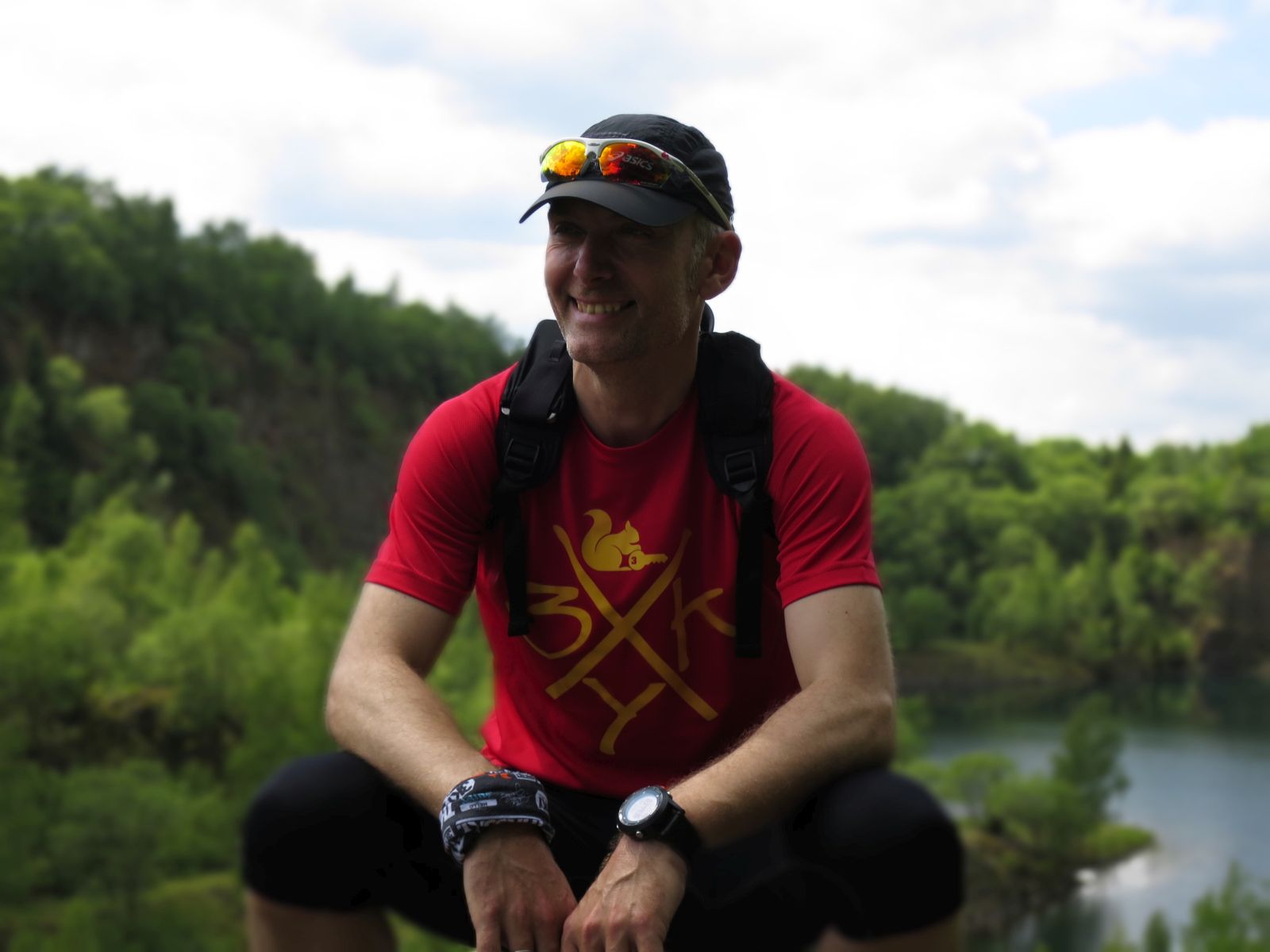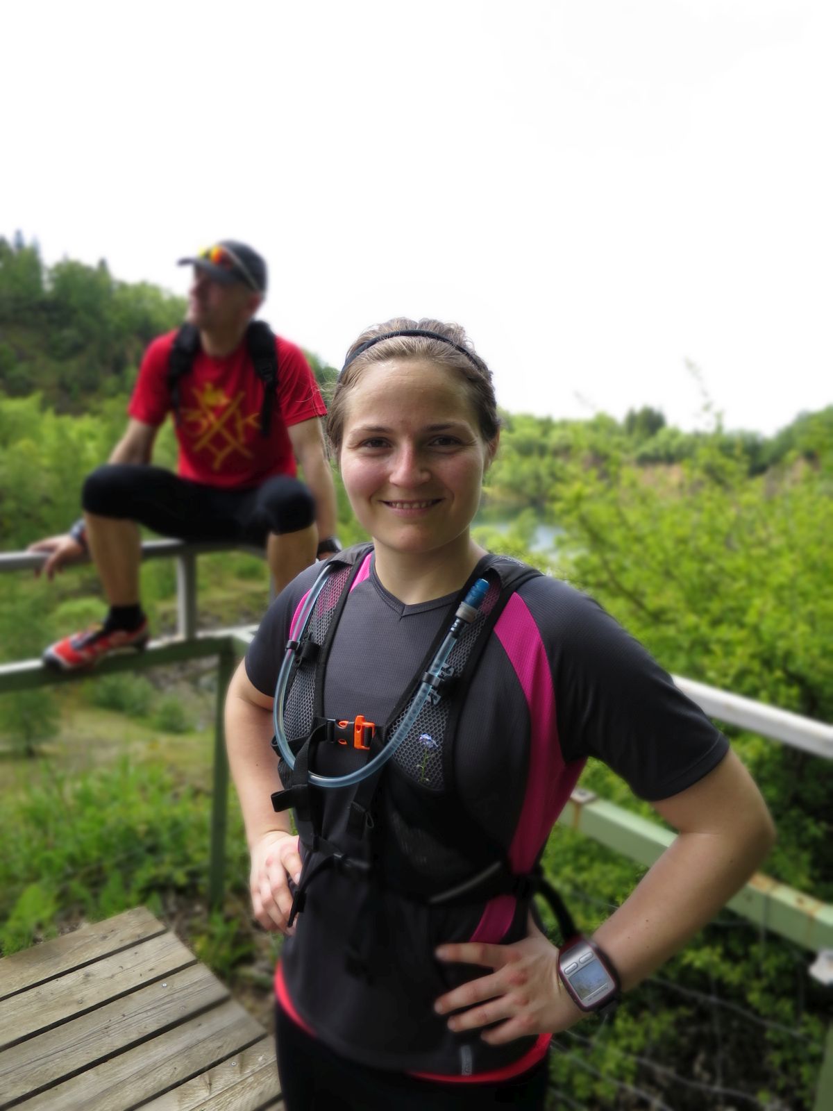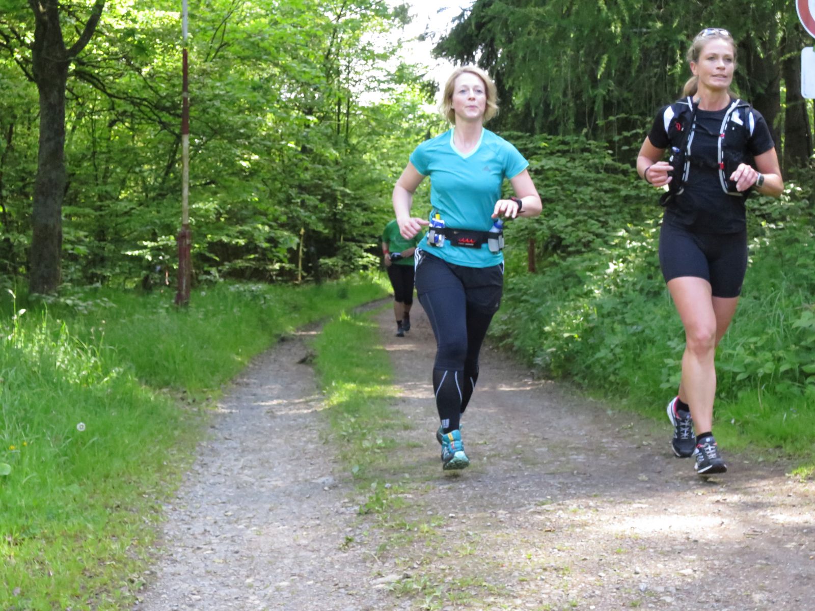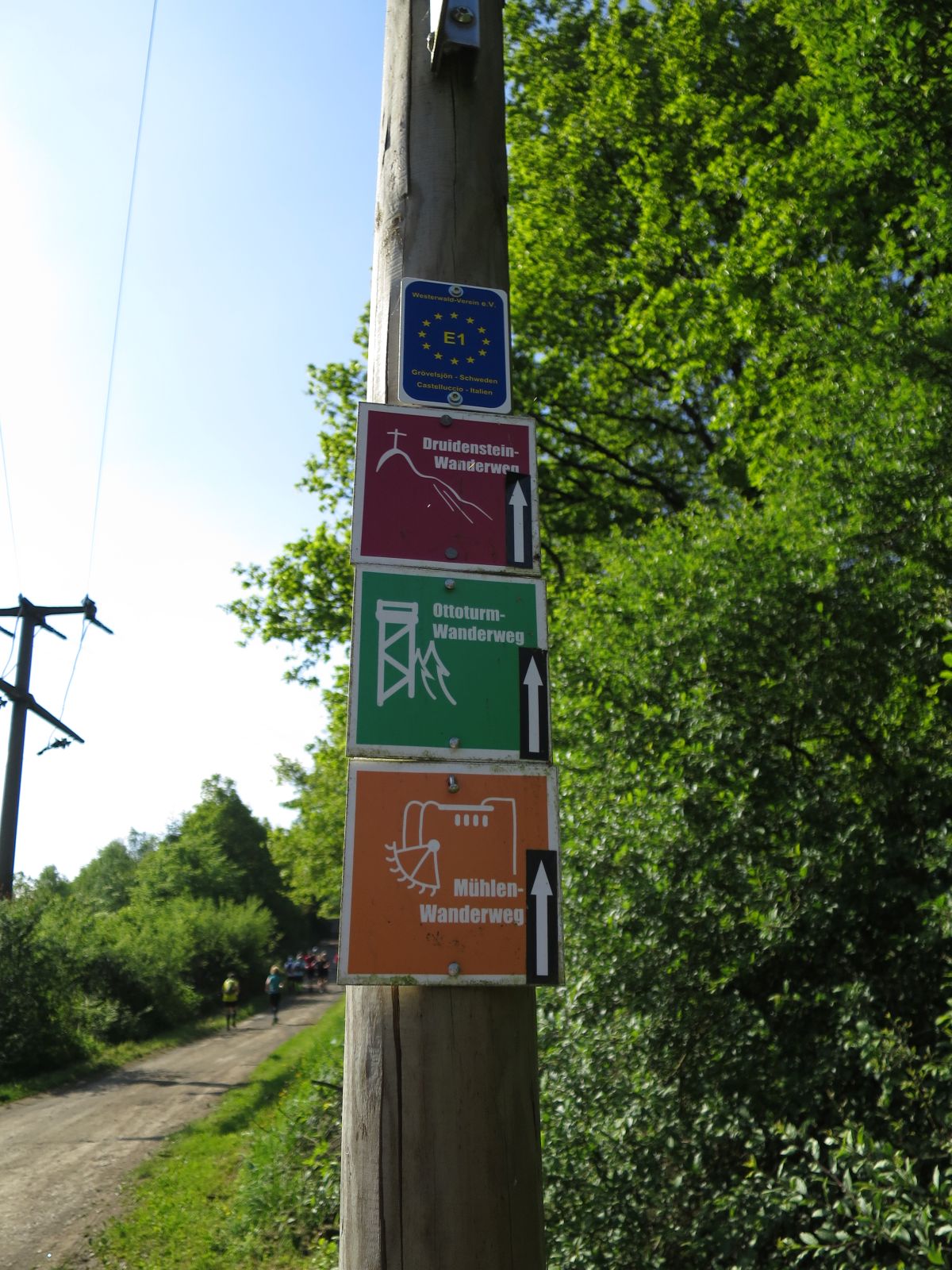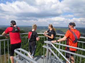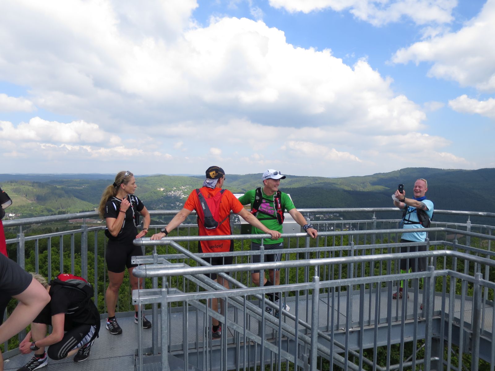 Frank hat sich für den heutigen Tag dabei eine super Strecke ausgesucht. Wir folgten zuerst auf der Straße grob dem Verlauf der Sieg in Richtung norden um dann in der Nähe der Freusberger Mühle kehrt zu machen und den Einstieg auf den Druidensteig zu nehmen. Dieser quert kurz Katzenbach und führt dann zum Otto-Turm von welchem man ein geniales Panorama genießen kann und bei gutem Wetter sogar bis zum Siebengebirge blicken kann. Natürlich ging es bis zum Otto-Turm auch schon ein Stückchen bergauf. Doch wurde sich immer an den langsamsten Läufer orientiert und regelmäßig nach den Anstiegen oder an Abzweigungen gewartet, bis die Gruppe wieder vollständig geschlossen war.