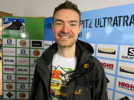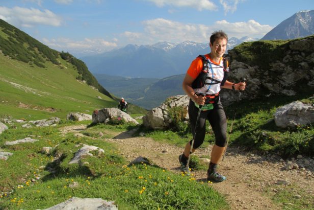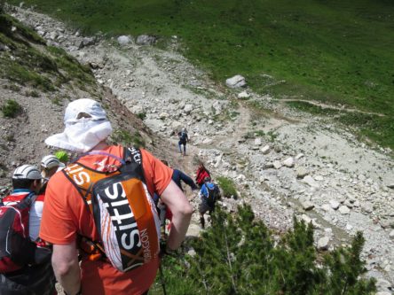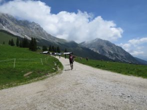 An diesem Tag verlief allerdings auch der erste nennenswerte Downhill zur Gamsalm, die die zweite Verpflegungsstation übernahm, alles andere als hervorragend. Ich hab bis und an diesem Verpflegungspunkt ca. 2.5 Liter Wasser getrunken, was mir auf die bisher zurückgelegte Strecke und Strapaze unheimlich viel erschien. Aber ich wollte unbedingt wieder mit vollen Trinkreserven aufbrechen. Von der Gamsalm ging es in Richtung Ehrwald. Dort musste ich mir bildlich an den Kopf fassen, als wir in Richtung Ehrwalder Alm über einen alten Bekannten aufstiegen: Der doch extrem steile Wiesensteig. Vor ein paar Wochen wählte ich mit meinem Bruder noch den Kloppen- und Wiesensteig als Aufstieg auf die offizielle Strecke des ZUT und witzelte darüber, dass dieser viel zu steil für eine solche Veranstaltung sei. Nun befand ich mich wider Erwarten abermals darauf und “genoss” den sehr direkten und 100-200 Hm beinhaltenden Aufstieg auf ebeneres Gelände. Moralisch eigentlich schon am Ende. Das nächste Stück bis zur Ehrwalder Alm verläuft jedoch relativ locker. Ich lernte Jean-Charles Perrin kennen und kurz vor der Ehrwalder Alm erwartete uns wieder Olivers Frau und feuerte uns an, obwohl Oliver selbst wohl zu dem Zeitpunkt schon eine halbe Stunde Vorsprung hatte.
