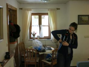 Später in Augsburg wurde unser leibliches Wohl von meinem Bruder mit äußerst gelungenen selbstgebackenen Pizzen versorgt, ehe wir seinen Wagen mit Wasserkästen, Proviant, Gepäck und uns beluden. Mein Bruder übernahm die letzten 2 Stunden fahrt nach Grainau. Dort wartete eine optimale Ferienwohung auf uns, die gerade durch ihre optimale Lage in Start- und Friedhofsnähe hervorstach. Als wir ankamen heißte uns völlig überraschend Oliver mit seiner Familie in der angegliederten Gaststube in Grainau willkommen. Eine äußerst freudige Überraschung!