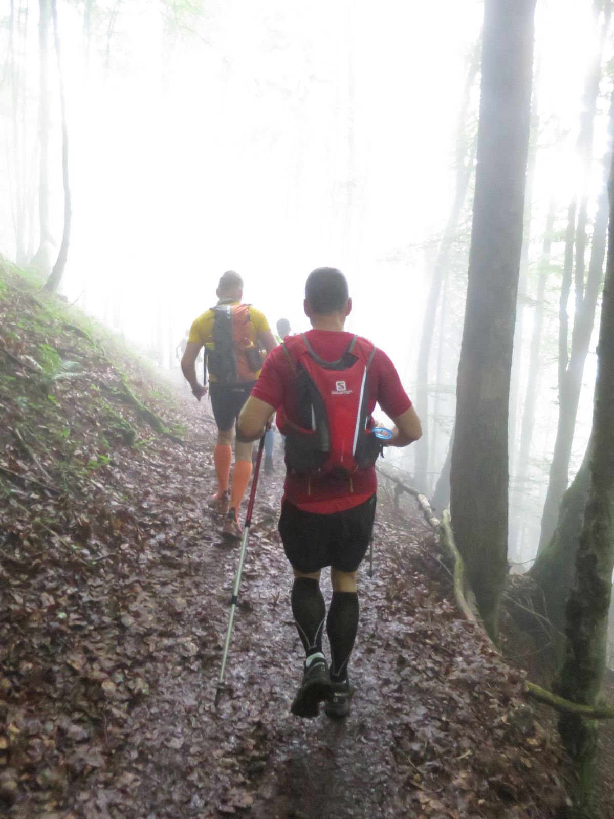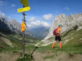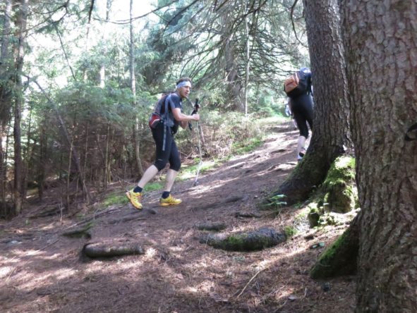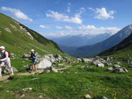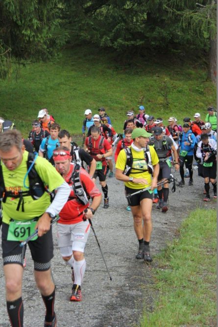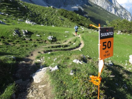 Allerdings merkte ich  schon wenig später wieder, dass ich Olivers Tempo am heutigen Tag vermutlich nicht lange mehr Folgen kann. Es kamen nun die Skipisten hoch in Richtung Hohes Egg, die ich im April noch mit meiner Freundin durch den Schnee hochgestampft bin. Ich dachte damals durch den Schnee wäre der Aufstieg anstrengend gewesen, aber heute war es noch viel anstrengender – mein Puls war zu hoch, meine Atmung permament zu schnell. In den dortigen Serpentinen, und somit nach 15-20 km  konnte ich dann Oliver nicht mehr folgen, als er ein Überholmanöver am Berg einleitete. Ich winkte ihm ein paar Minuten später von weiter unten zu, dass wir uns später oder im Ziel wiedersehen würden. Ein wenig schade, aber so konnte ich mir am Berg eine kleine Verschnaufpause gönnen um zu Atem zu kommen. Mit den immernoch anhaltenden leichten Kopfschmerzen war nun meine Priorität meinen eigenen Rythmus zu finden um das Rennen immerhin beenden zu können. Auf diesem Weg zur deutsch-österreichischen  Grenze, die ungefähr auch den ersten Gipfel des ZUTs markiert, ertappte ich mich dabei, dass ich immer mal wieder ein paar Päuschen am Berg einlegte, in Folge dessen mich viele Läufer überholten.