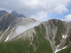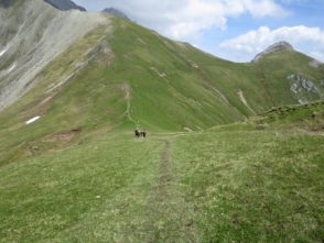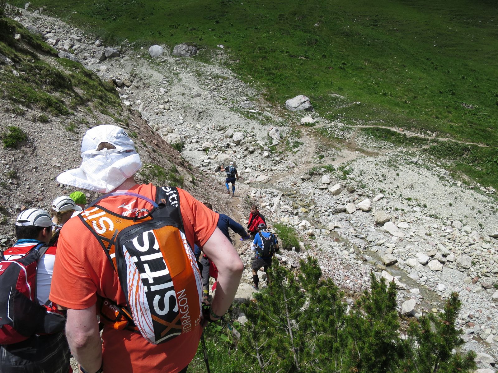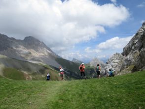 Aufstieg führte nun durch schönstes Sommerwetter und diesesmal völlig schneelos hoch zu den Hochfelder Joch und auch auf diesem Aufstieg hielt ich einige male Inne um die schöne Aussicht zu genießen (und Atem zu finden).  Dann kam die nächste Demoralisierung. Am Hochfelder Joch sah man eine Menschenkette den Kam hochlaufen. Diesen Kamm lief ich ebenfalls vor ein paar Wochen mit meinem Bruder hoch, da der umführende Weg verschneit war. Damals zeigte der GPS Track eindeutig, dass der Weg daran vorbeigehen würde. Der steile Kamm hat sich so bei mir im Gedächtnis als äußerst anstrengend festgebrannt. Aber es hilft alles nichts. Hoch gings und hinten über milde Wiese dann wieder runter.