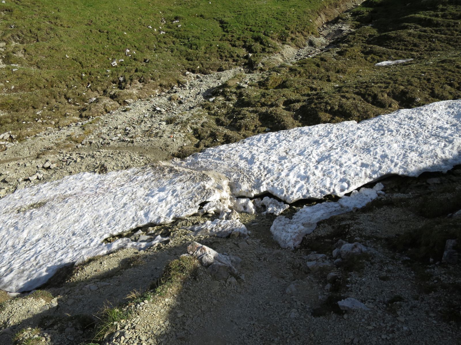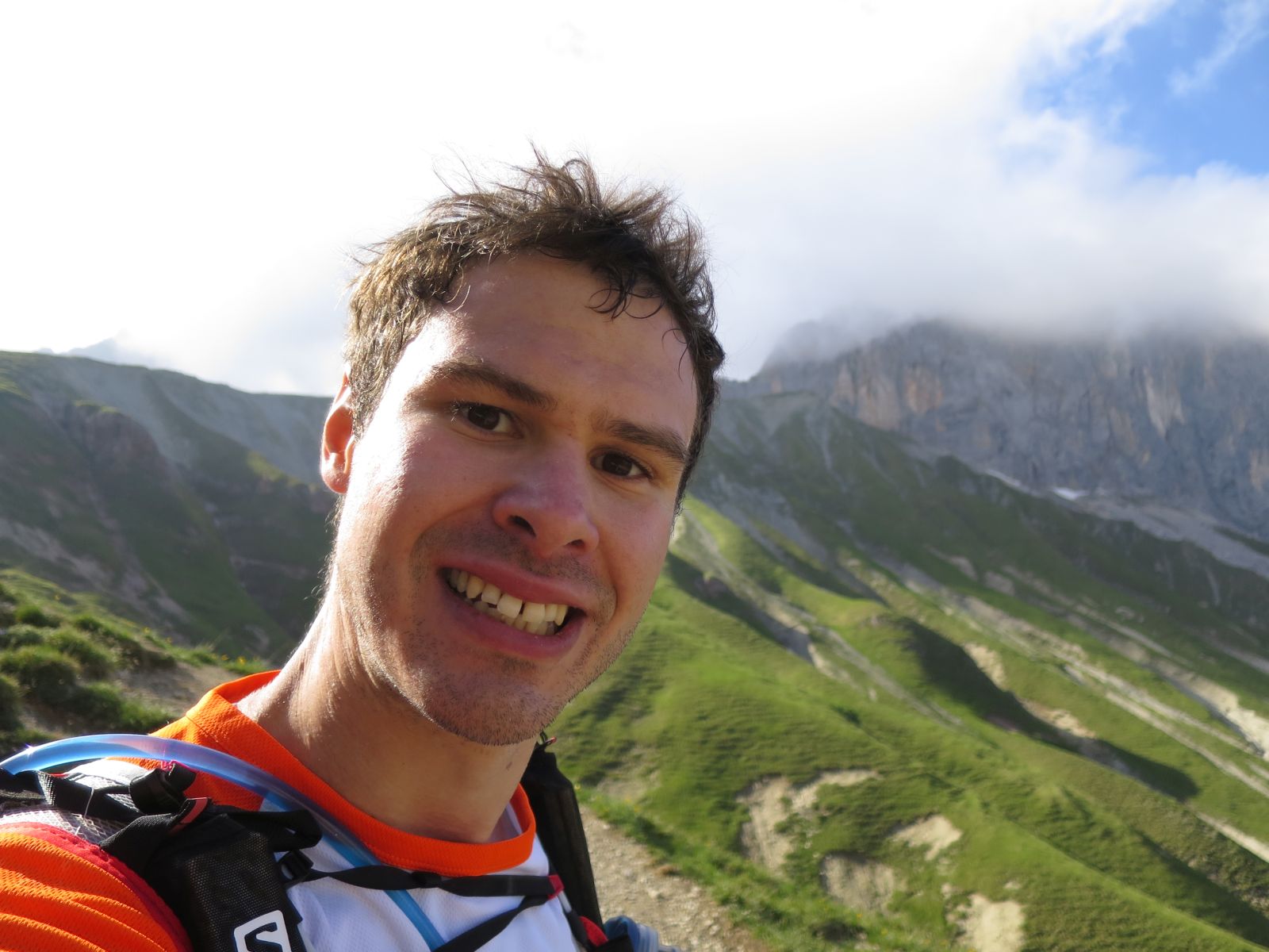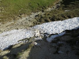 Der Rest des Weges verlief deutlich weniger anstrengend als damals querfeldein durch die Schneefelder und langsam waren auch die Kopfschmerzen völlig verschwunden und in meinem Gesicht machte sich ein lächeln breit. Von hier kannte ich fast die komplette Strecke und die Erinnerung war noch frisch. Es ging unproblematisch, wenn auch etwas langsam bis zum Scharnitzjoch. Eine detailierte Streckenbeschreibung findet man dabei in einem meiner alten Blogeinträge. Oben hielt ich Inne um meinem Bruder ein Bild von der nun passierbaren “Nordflanke” zu machen, die bei uns damals noch völlig im Schnee lag. Ein Blick auf das Handy zeigte jedoch eine Nachricht meiner Freundin: beide wären völlig stolz, dass sie den Basetrail erfolgreich und in top Zeiten absolviert haben. Nun musste als nur noch ich die letzten 50 km des Rennens zurücklegen.
