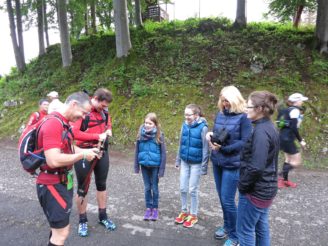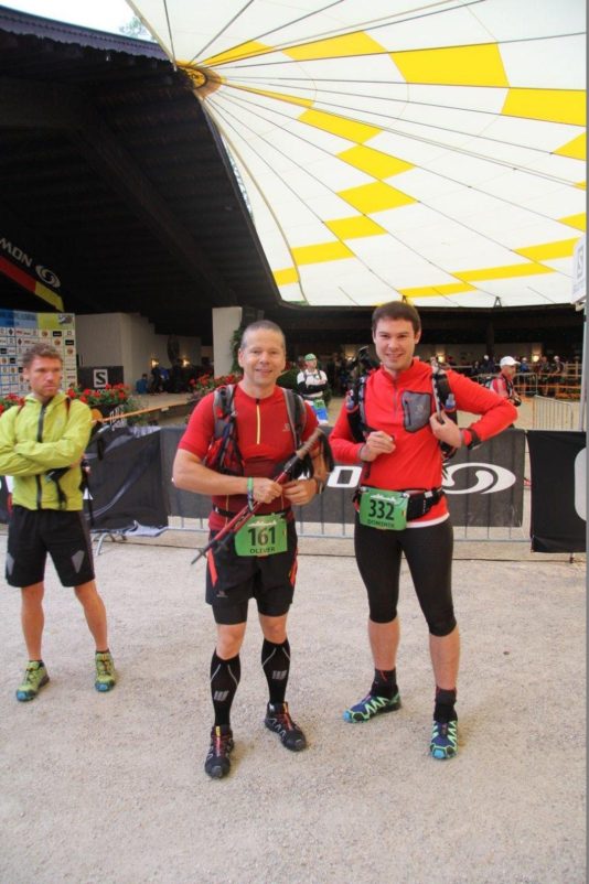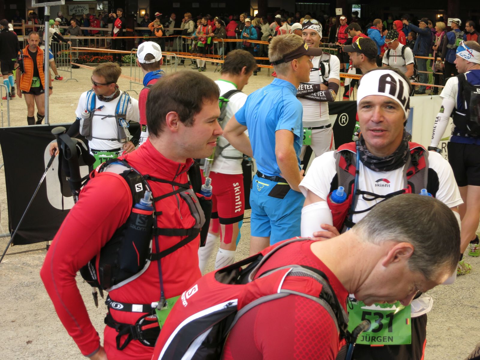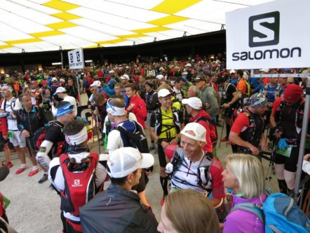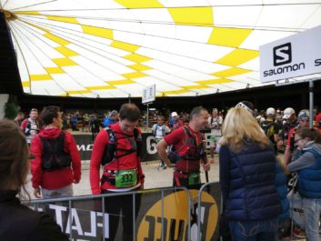 Nach einem “guten Morgen” ging es dann auch schon in den Musikpavillon, wo ich davon ausging, dass mich noch ein kleines Frühstück erwarten würde. Dabei fiel mir auf, dass ich sowohl am Vorvorabend als auch am Vorabend zu wenig getrunken habe und somit ein latentes Durstgefühl spürte. Aber für solche Dinge blieb keine Zeit mehr: Wir gingen sofort durch die Kontrollstellen, an denen unsere Pflichtausrüstung kontrolliert wurde und dann waren auch schon die niederen ernährungstechnicchen Bedürfnisse erst einmal vergessen. an den Banden außerhalb des Startes wartetenden unsere Familien und kurz später gesellte sich sogar noch Jürgen dazu, der zumindest mich mit seiner penibel vorbereiteten und immer Griffbereiten Ausdrucke der Verpflegungspunkte und des Höhenprofils verblüffte. Das ist gute Vorbereitung. Ich dachte mir, dass ich immerhin schonmal in diesem Jahr fast 90% der Strecke abgewandert bin und somit große Teile der Strapazen kennen würde, was doch immerhin auch ein wenig als Vorbereitung gelten muss.