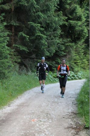 Der Abstieg von Scharnitzjoch bis zur Hubertushütte zieht sich ewig und dabei wurde mir auf dem letzten Stück klar, dass ich mit meinem Bruder damals noch eine kleine Steigung ausgelassen habe und auf direkten Wege in der Dunkelheit zur Hütte gegangen bin – Mehr unbekannte Strecke als gedacht. Auf dem letzten Teil des Abstiegs stoß ich auf den jugendlichen Tom, der Probleme mit dem Bein hatte und bereits ein wenig humpelte.  Am Hubertushof bestätigten wir den anwesenden Medizinern, dass wir jedoch weiterlaufen könnten und wollen würden. Wir huschten so vorbei an den in Notdecken gewickelten Gestalten zu unseren Dropbag. Tom und ich beschlossen das nun folgende langweilige Stück bis Mittenwald gemeinsam zu Bewältigen und nach einiger Pausenzeit, in der ich jedoch keinen Schuh- oder Sockenwechsel vollzog, wohl jedoch die viel zu heißen Stulpen weglegte, ging es dann auf dem Gerade nund langweiligen Teil der Strecke weiter. Leider konnte Tom trotz Ermutigung und gutem Zureden sowie der ein oder anderen Ablenktaktik immer nur Schübeweise und nur wenige hundert Meter  am Stück zum Laufen motiviert werden. Ich meine bei Schanz wäre es gewesen, wo mich ganz unverhofft Olivers Frau noch einmal zusammen mit Tom zum Laufen und weitermachen motivierte. Als es etwas hügeliger an der Leutascher Geisterklamm wurde, meinte Tom ich solle ruhig schon einmal vor. Das tat ich dann auch und passierte schon bald den Ortseingang von Mittenwald, wo ich eine Stimme im Hintergrund vernahm. Meine Freundin hat mich gesehen und entdeckt!
