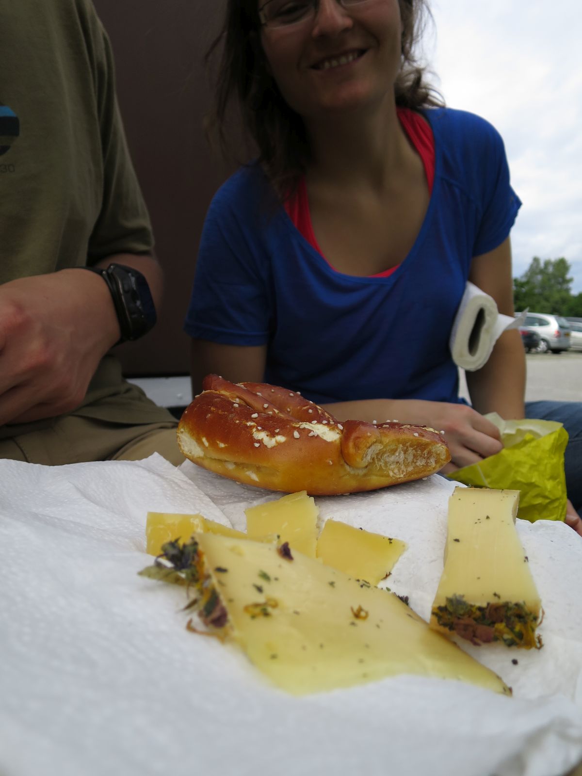 Danach nochmal auf unsere kleine Stube, die Sachen ins Auto schleppen und auf ging es nach Mittenwald. Der Tag sollte auch weiterhin im Zeichen des Kaloriennacholbedarfs stehen. An der Bäckerei in der Nähe des Bahnhofs holten wir eine Breze und schlenderten durch den stilvollen Stadtkern Mittenwalds zu einem kleinen Käseladen um noch einen Berg- und Bergblütenkäse zu kaufen. Danach ging es in Richtung Auto zurück, in dessen Nähe wir unserer erworbenen Nahrungsmittel auch direkt verspeisten.