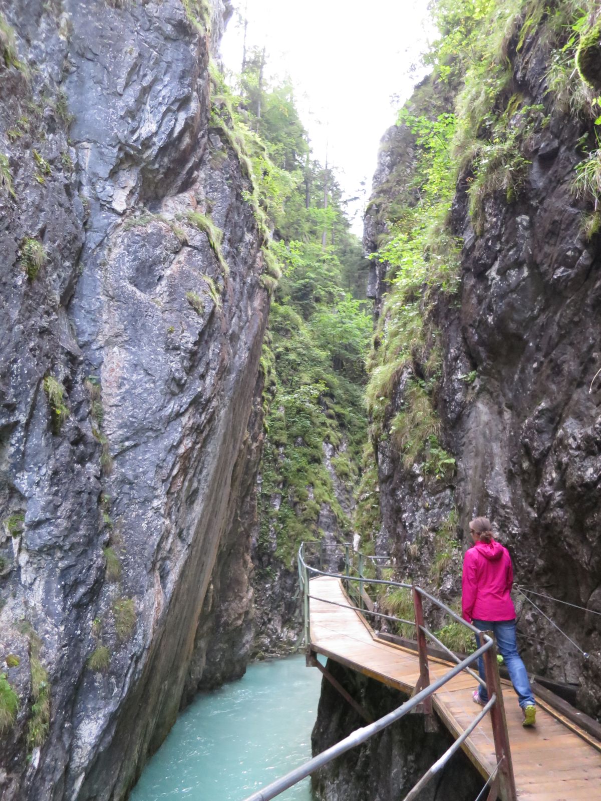 Wir hatten Glück: Trotz der morgigen Großveranstaltung hatten wir auf dem kleinen Platz in bester Lage noch einigermaßen freie Platzwahl für unser Zelt. Nach dem Zeltaufbau zog es uns noch einmal in Richtung Mittenwald zurück um dort einen lockeren Spaziergang durch die Geisterklamm zu machen. Wir zahlten ein wenig Eintritt für den viel zu kurzen Wasserfallsteig, der uns in der Klamm auf sehr gut befestigtem aber enttäuschend kurzen Weg in die Nähe eines Wasserfalls brachte. Wir hielten uns dort auch nicht lange auf und machten uns auf dem Rückweg um noch den Koboldpfad bzw. den Klammgeistweg abzulaufen. Die beiden ineinanderübergehenden Wege führen zu einem Großteil der Strecke auf einem extrem übersicherten künstlich angelegten Gang durch die Schlucht. Aufgrund der Übersicherung sollten auch Personen mit Höhenangst meines Erachtens keine Probleme bei der Begehung haben. Mit all den Geländern und Seitenwände kommt es einem einfach nicht so vor, dass man gerade mehrer Meter über dem “Nichts” steht.