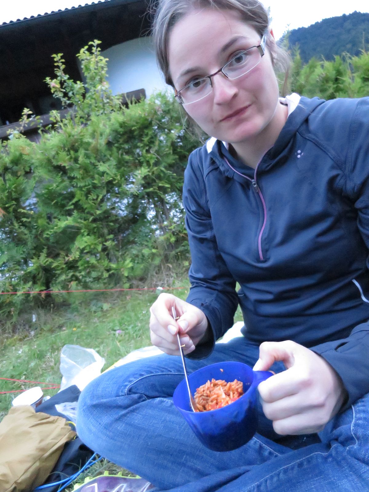 Zurück am Ausgangspunkt stiegen wir in unser Auto und fuhren zurück zum Zeltplatz nach Scharnitz. Wir musste noch Sachen für den morgigen Marsch packen und wollten auch mal von unseren Gaskocher gebrauch machen: Paprika mit mediterranen Reis stand auf dem Programm, den wir bei einziehender Dunkelheit auch zu genießen wußten. Dazu gab es noch ein paar Scheiben Brot, welches wir zuvor noch in Mittenwald gekauft hatten.
