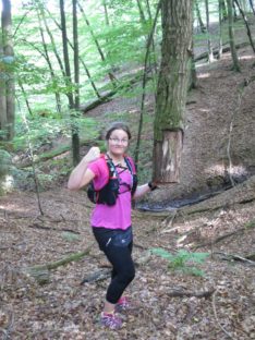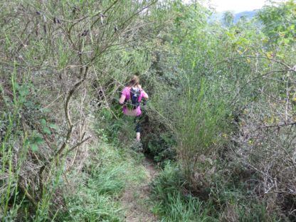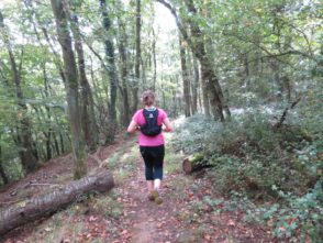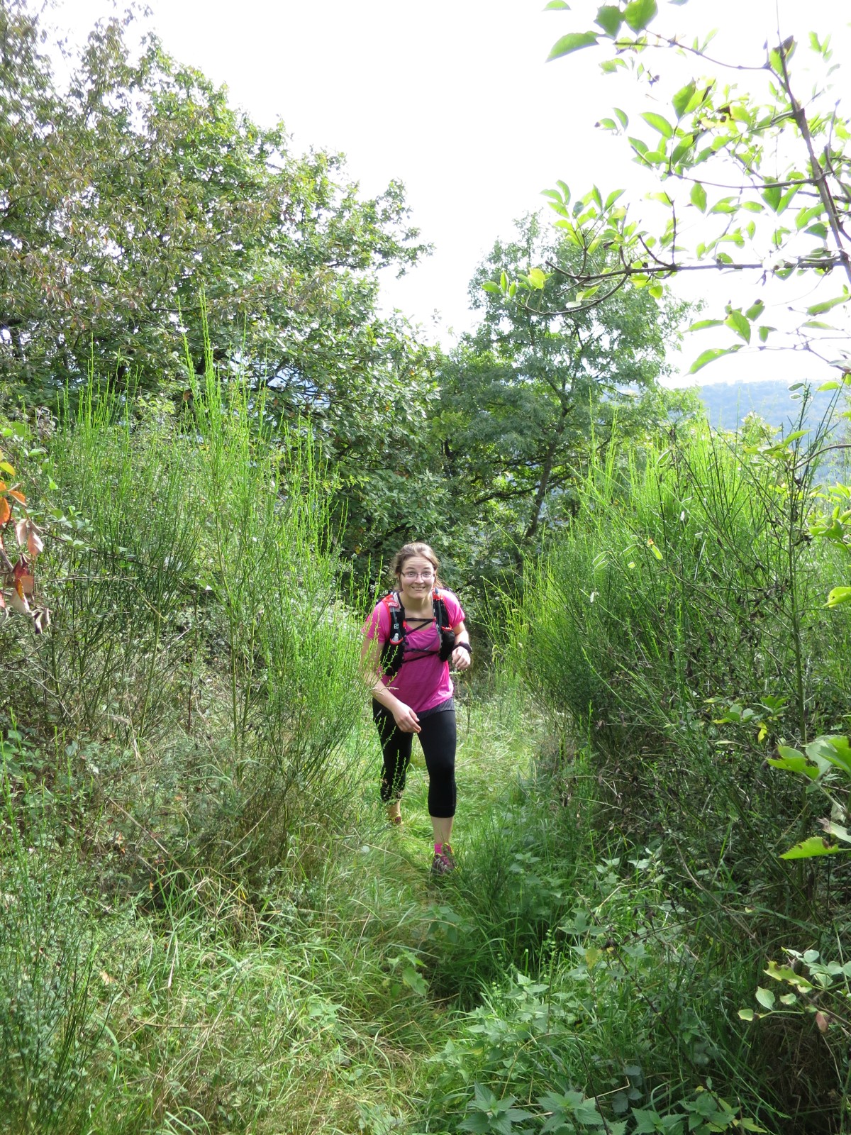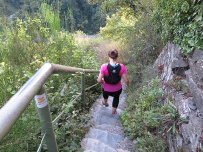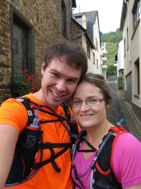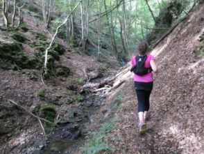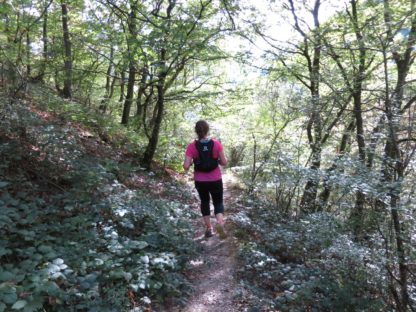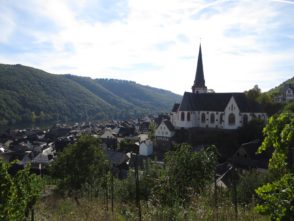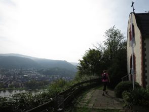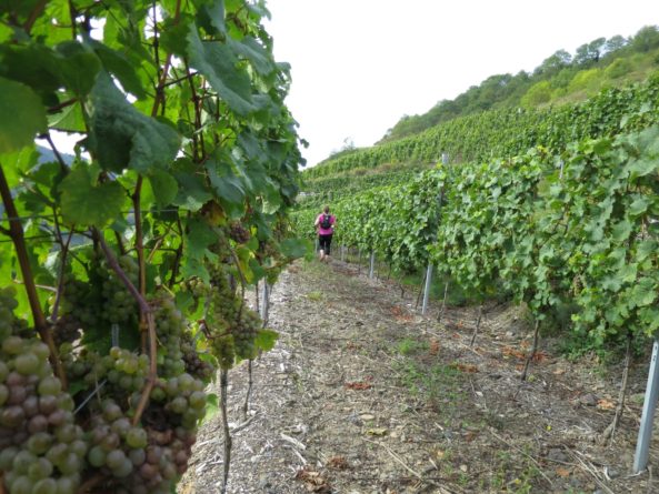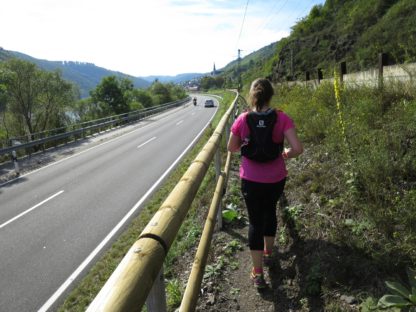 Von der Kapelle aus machten wir uns auf die Suche nach dem Moselsteig, dessen Spur wir dann auch zügig durch die Weinberge wieder aufnahmen. Wir kamen traubentechnisch zur besten Jahreszeit. Es war herrlich so durch die Weinberge zu laufen. Der Weg verlässt allerdings schon bald die Mosel wieder auf einen schluchartigen grandiosen Anstieg durch den Wald. Das schöne Stück führt auf fast 2 km stetig bergauf nach Kail. Meine Freundin lief im guten Tempo vor und mir gelang es erst kurz vor Kail sie zu überholen.