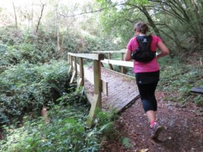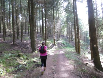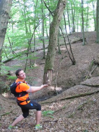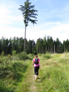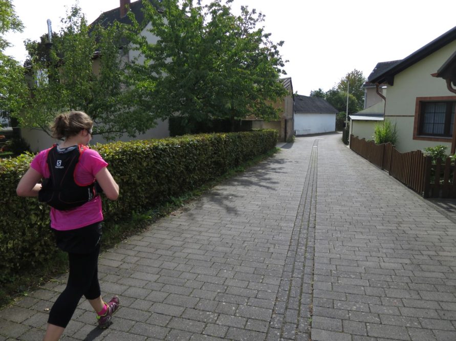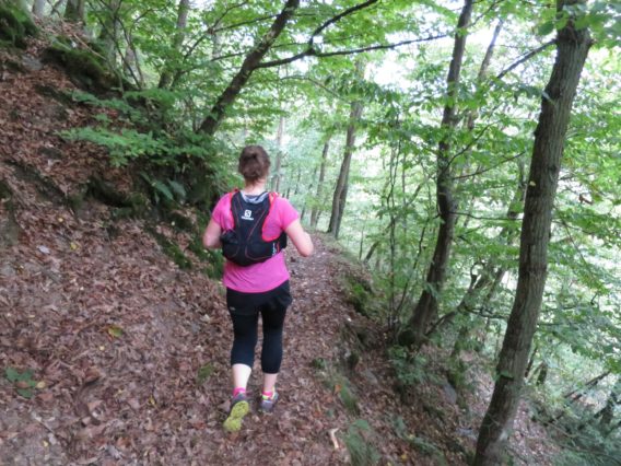 Ganz so falsch konnten wir aber nicht sein, immerhin muss ja notwendigerweise der moselsteig irgendwo in der nähe verlaufen und so liefen wir am Rand des Feldes weiter bis uns irgendwann wieder ein Wegweiser begegnete und uns zurück zur Kapelle lotste. Der Weg dorthin ging allerdings durch den Urwald. Auch wenn uns die Schleife ein paar anstrengende Meter mehr eingebracht hat, war sie läuferisch dennoch äußerst abwechslungsreich und fordernd und wir bereuten die Extrarunde keine Minute lang.