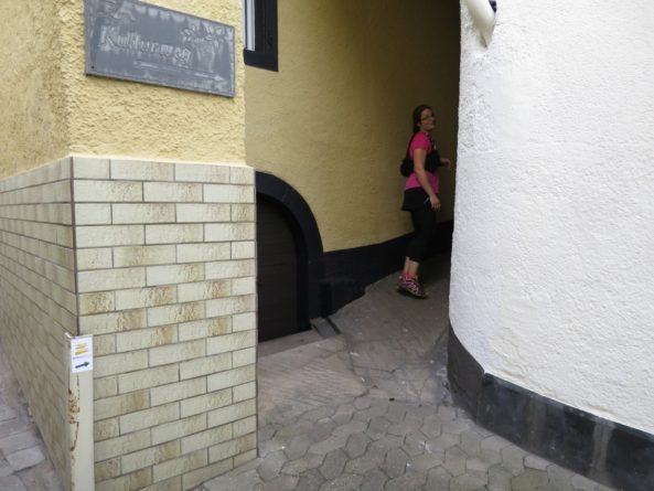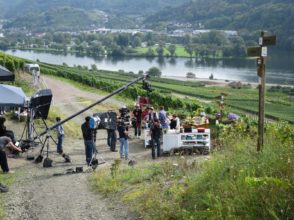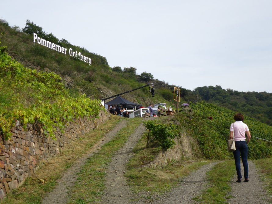 Der Moselsteig führt einen dann weiter in Richtung Pommern und baut dabei all die schwer erkämpften Höhenmeter wieder ab. Auf dem Abstieg durch die Weinberge mogelten wir uns noch möglichst leise am Drehort einer Kochsendung vorbei.