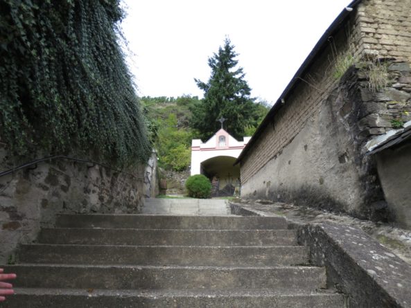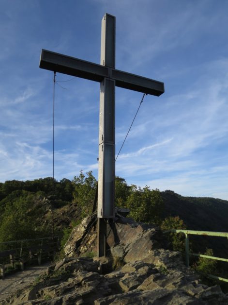 Pommern wird ein sehr kurzes Stück durchlaufen ehe man sich auf einem Kreuzweg wieder nach oben kämpft. Auf dem Kreuzweg gelangt man zu einer Weggabelung mit einer Station des Kreuzwegs in der Mitte. Hier sollte man aufpassen, es war die einzige schlecht ausgeschilderte Situation auf dieser Etappe des Moselsteigs und wir entschieden uns auch prompt für die falsche Abzweigung. An der Gabelung sollte man links herum laufen und somit den Kreuzweg verlassen. Wir folgten jedoch dem Kreuzweg rechts herum und liefen so zu einer Kapelle.