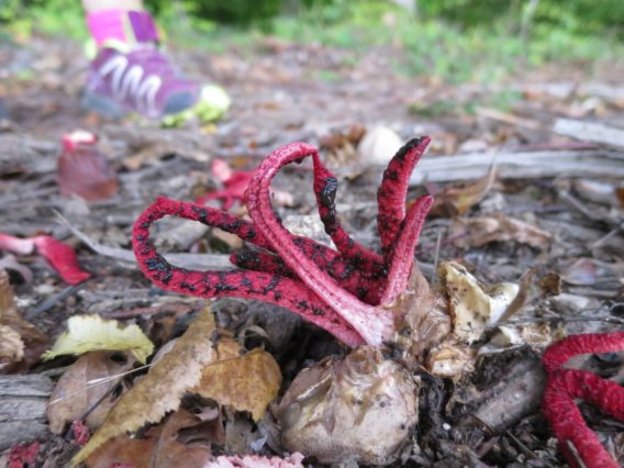 Kail durchläuft man recht kurzweilig auf der Hauptstraße. Von dort geht es dann die nächsten 5 km recht eben durch Wald, Feld und Flur. Ein Highlight sei dabei jedoch nicht unerwähnt. Unterwegs ist ein Pausenpunkt, an dem eine Verpflegungstruhe mit Getränken für Wandersleute aufgestellt ist. Eine wirklich tolle Idee! In der nähe fanden stießen wir auch auf eine uns unbekannte tentakelförmige Pilzart, gar alienhaften Tintenfischpilzen, die äußerst interessant wirkten.