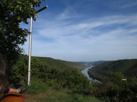 Kurz vor der Tempelanlage kann man den Moselsteig nocheinmal in Richtung eines Aussichtspunktes verlassen, an dem wir eine kurze Frühstückspause eingelegt haben, ein paar gekochte Eier zu uns nahmen und den Blick über die Mosel schweifen ließen.