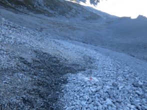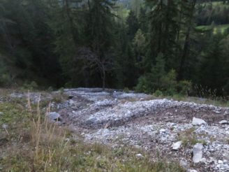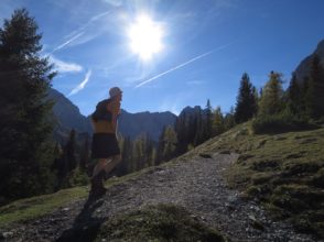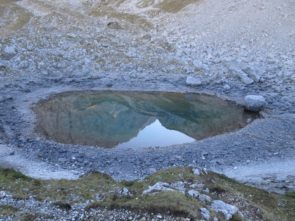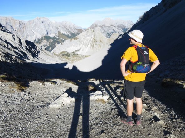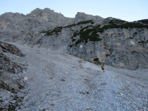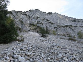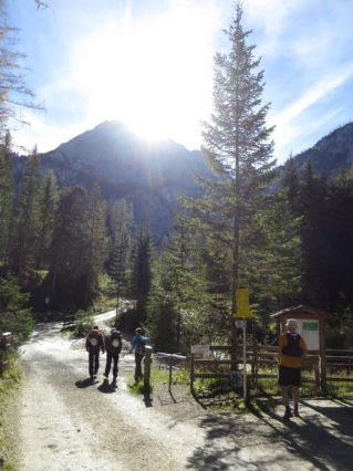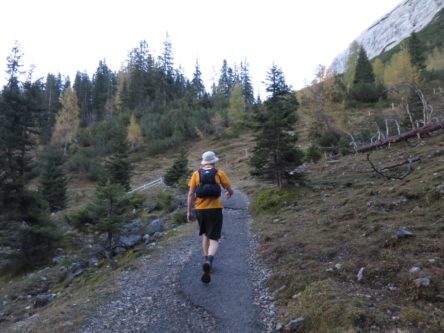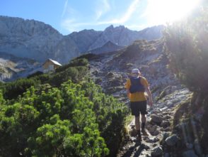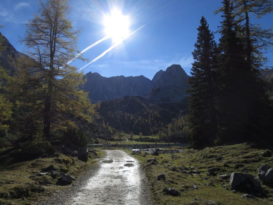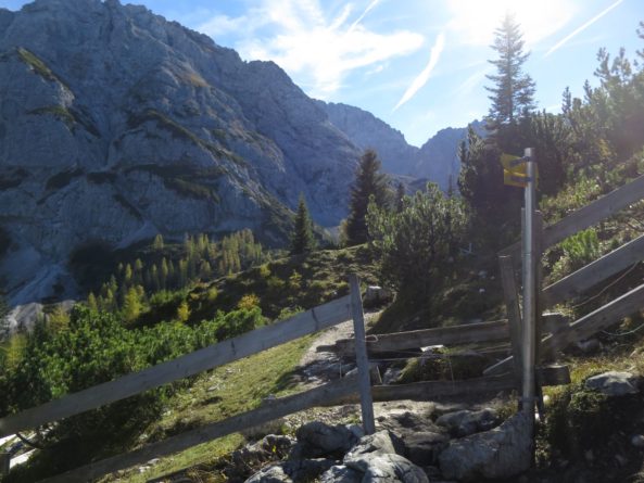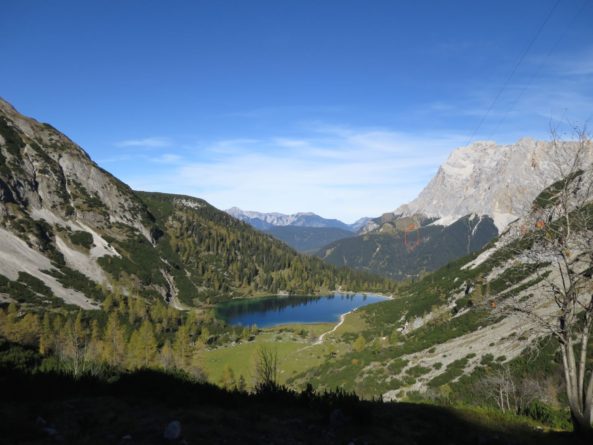 Der Abstieg führte uns dann über das Tarjatörl. Die nachfolgende Strecke bergab durch Schotter und Schutt und Felsen ist recht trist und kark und stellte den ödesten und langweiligsten, wenn auch kurzen, Part dieser Tour dar. Zudem fing mein rechter Fußballen bergab nun an Probleme zu bereiten, so dass wir am Brendlsee, den wir beinahe übersehen haben, eine kleine Zwangspause machen mussten. Von dort ging es weiter, teils über Geröllfelder in Richtung Ehrwald zurück. Der Weg wird wieder schön, sobald man durch die ersten Bäume läuft und es um uns herum herbstlich-golden-grün wurde. Bald waren wir so wieder auf den breiteren Wanderwegen rund um die Ehrwalder Alm.