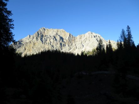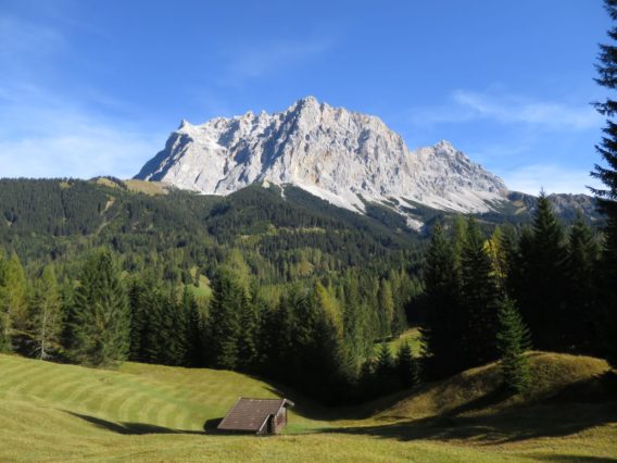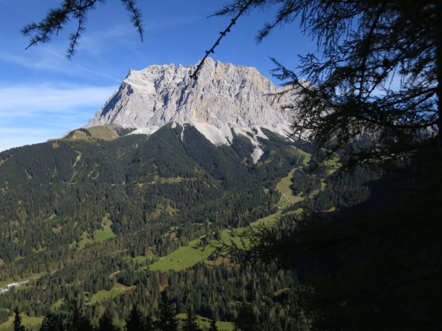 Schon nach kurzer Zeit, nachdem man den kurzen Zubringer in die Berge in Richtung Wald verlässt und noch lange bevor man großartig an Höhe gewonnen hat, konnten wir den Panoramablick auf das Wettersteingebirge genießen.