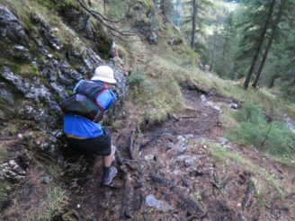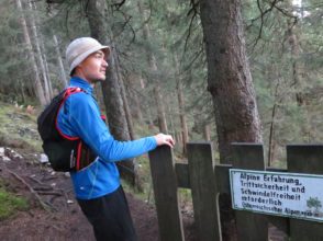 Die Ganghofer Rast und von dort den Einstieg auf den Immensteig fanden wir durch einen kleinen Verläufer erst beim zweiten Mal. Überrascht waren wir als wir kurz hinter der Schutzhütte das Gatterl erreichten, vor dem auf Alpine Erfahrungen aufmerksam gemacht wurde. Was sollte so kurz vor Ehrwald in dieser Gegend schon auf uns zu kommen? Völlig unerwartet stießen wir so auf einen sehr steilen, abfälligen und durch den matschigen Untergrund teils über glatte Wurzeln rutschigen kleinen Klettersteig. Trotz der Warnung haben weder mein Bruder noch ich an dieser Stelle damit gerechnet. Konzentration war also angesagt und wir ließen das Gröbste genau dann hinter uns, als die Sonne sich langsam in ihr Bett verabschiedete.