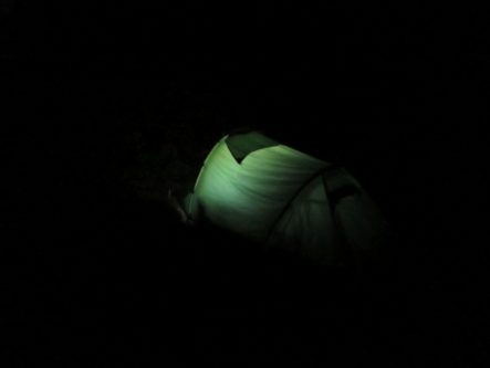 Am Auto genoßen wir eine deftige Brotzeit und machten uns dann nach etwas verschnaufen zu unserem Zeltplatz auf, an dem wir das Zelt mit Hilfe des Autoscheinwerfers aufzubauen versuchten. Eine Sache, die bei meiner Freundin weniger als 5 Minuten dauerte, zog sich dann bei uns Neulingen doch ein wenig und kurz nach dem Aufbau bemerkte mein Bruder, dass das Licht des Autos doch mittlerweile bedeutend schwächer wurde. Eine Vorahnung, dass wir die Batterie entleert haben breitete sich aus…aber das konnte bis morgen abend warten. Nun hieß es erstmal “Schlafenszeit”.