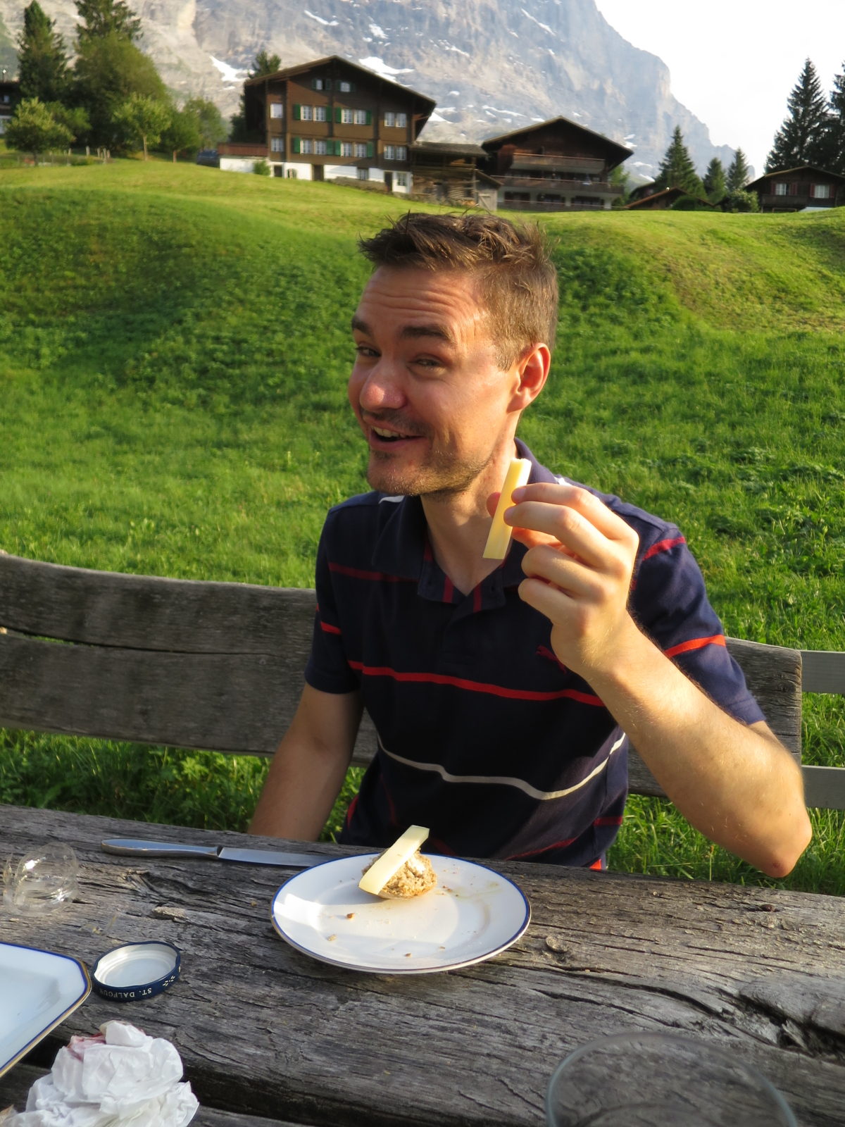 Grindelwald selbst ist als Stadt des Eigers natürlich touristisch überlaufen, was jedoch keineswegs irgendwie ein Nachteil ist. Beim Einkaufen ist man hingegen “überrascht”, wie teuer denn die Lebensmittel im Vergleich zu den hiesigen Preisen sind. Dennoch fanden neben jeder Menge Wasser auch eine Melone sowie mehrere Stückchen Käse ihren Weg in unsere Einkaufstasche, die wir anschließend mit dem Bus wieder in die Nähe unseres Chalets. Dort genoßen wir im Lichte der untergehenden Sonne unser Abendbrot und den Käse auf selbstgebackenem Brot, welches mein Bruder überraschenderweise zusammen mit ein paar delikaten selbstgemachten Cookies aus seinem Rucksack zog.