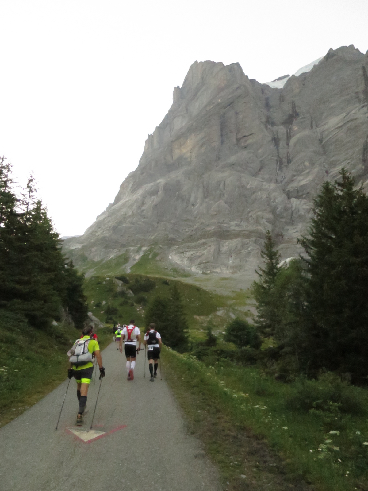 Während viele klitschnass waren, hatten wir Glück gehabt, dass wir keinen Tropfen Regen abbekommen haben. Dafür tat die lange Zwangspause meinem seit der Halbzeit stark angeschlagenem Körper nicht sonderlich gut und als es dann wieder hieß, dass das Rennen fortgesetzt wird, es jedoch direkt nach Grindelwald ginge, musste ich sämtliche Kraft zusammennehmen um nicht direkt an diesem VP aufzuhören. In der Nachbetrachtung kann ich nicht mehr genau sagen, ob es nur Kopfschmerzen und starke Übelkeit waren, die mich an einem Weiterlaufen hinderten, aber für mich ging es vor allem nur noch langsam gehend voran. Da es direkt nach Grindelwald gehen sollte, wurde insbesondere das Stück Eigertrail/Eigergletscher ausgelassen – Es war nach den doch recht starken Gewitter und Regen zu gefährlich zu passieren. Da ich mich nur sehr schleppend fortbewegte, fragten wir auch am nächsten Verpflegungspunkt Alpiglen nach, ob es tatsächlich direkt nach Grindelwald gehen würde, was bejaht wurde. Moralisch also darauf eingestellt, dass es “`nur noch”‘ bergab ginge und wir somit in wenigen Kilometern am Ziel seien, machten wir uns weiter durch die Nacht. Entgegen der Auskünfte ging es dann bei Trychelegg weiter in Richtung Marmorbruch. Hätte ich mich normalerweise darüber gefreut doch noch möglichst viele Kilometer auf der Originalstrecke abzuspulen, so ging es mir diesesmal so schlecht, dass es mich richtig fertig machte und ich erstmal eine kurze Sitzpause brauchte um wieder zu Kräften zu kommen.